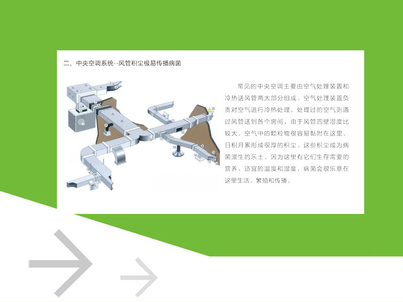 常见的中央空调主要由空气处理装置和冷热送风管两大部分组成。空气处理装置负广责对空气进行冷热处理,处理过的空气则通过风管送到各个房间,由于风管四壁湿度比较大,空气中的颗粒物很容易黏附在这里,日积月累形成很厚的积尘。这些积尘成为病菌滋生的乐土,因为这里有它们生存需要的;营养、适宜的温度和湿度,病菌会很乐意在这里生活、繁殖和传播。