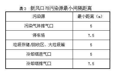 滤网。新风口(包括自然通风口)与室外污染源最短距离不得小于表3的要求: