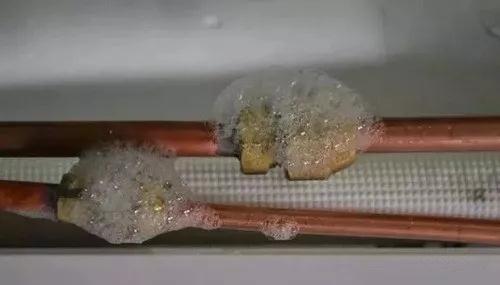 检漏方法:用水将毛巾(或海绵)淋湿,以不向下滴水为宜,倒上洗洁精,轻揉至丰富泡沫,涂在需要检查的部位,观察是否向外冒泡,冒泡说明检查部位有漏氟故障,没有冒泡说明检查部位正常。